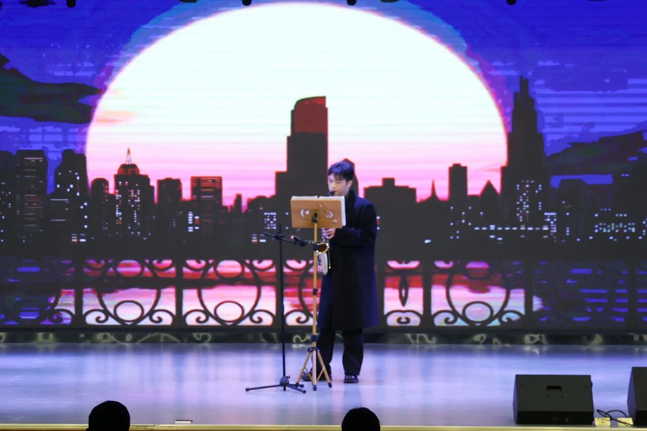 萨克斯演奏《大城小爱》以悠扬婉转的旋律,将城市烟火里的细腻温情缓缓铺陈,萨克斯的浪漫音色裹着柔软情绪,让舞台漫开治愈的氛围感。诗歌朗诵《将进酒》以豪宕的语调、洒脱的气韵,重现盛唐诗篇的磅礴风骨。朗诵者手持酒葫,时而挥臂展豪情,时而驻足凝思绪,肢体动作与诗句意境完美契合。舞台背景铺展水墨秀山图,瞬间将观众拉入盛唐酒局。