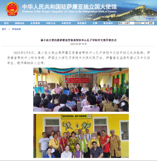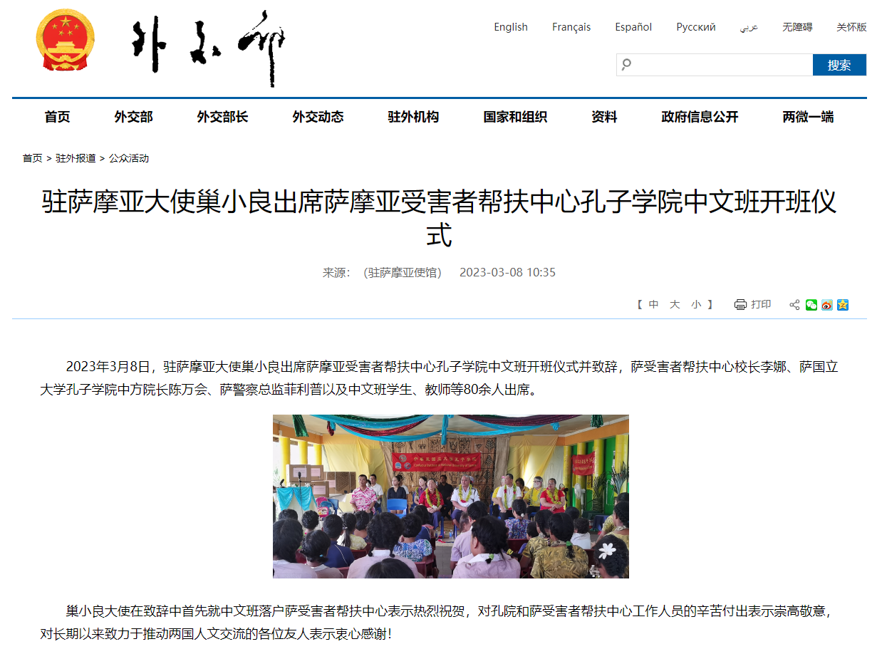 3月8日,国家外交部、驻萨摩亚使馆网站对萨摩亚受害者帮扶中心聊城大学孔子学院中文班开班仪式进行了报道。
