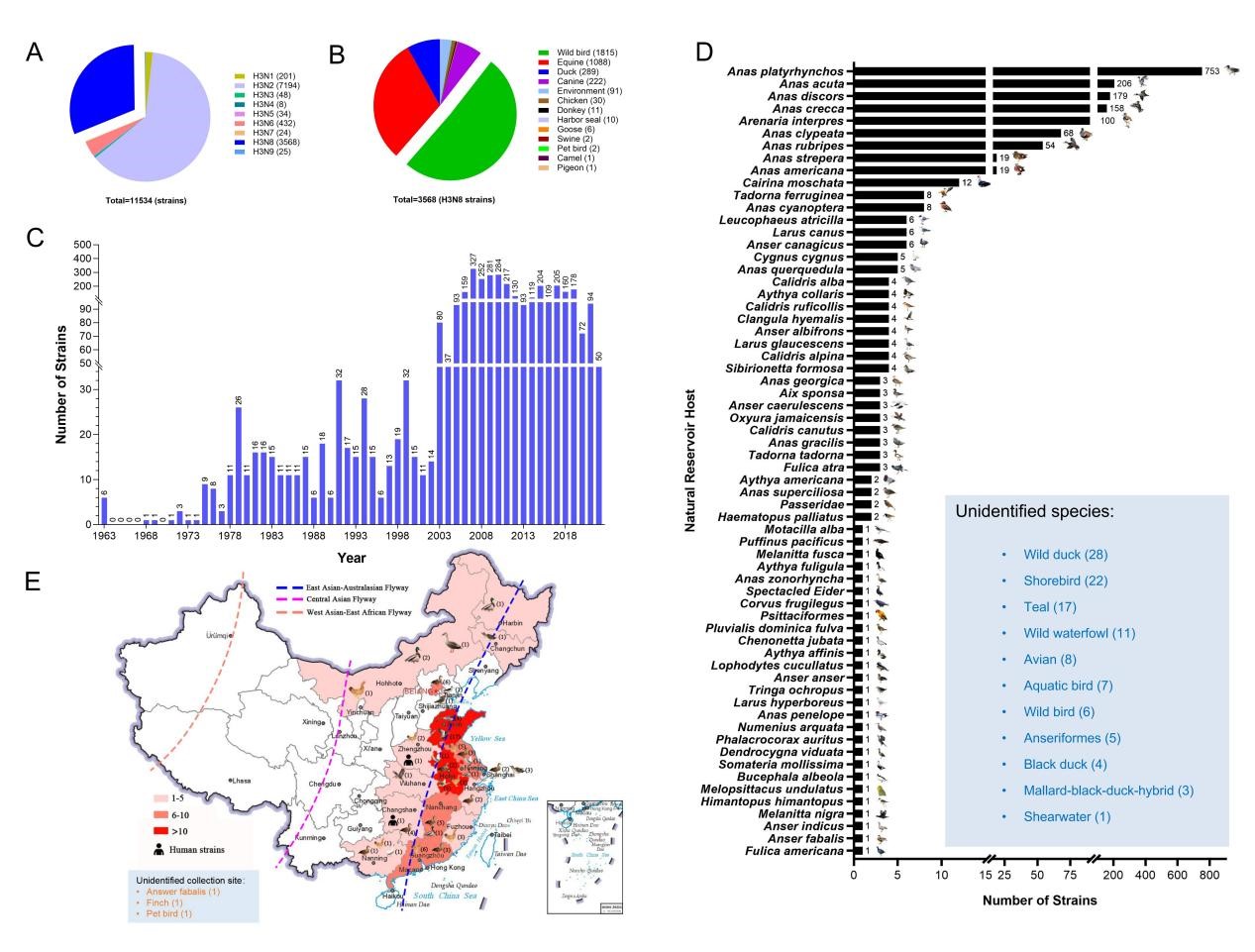本研究系统阐明了H3N8亚型禽流感病毒的宿主分布和时空流行情况,并对该病毒进行了系统的遗传进化和生物学特性分析。研究结果表明:1. 鸭科成员(野鸭、家鸭)是H3N8亚型禽流感病毒的主要宿主;2. H3N8、H4N6、H6N1、H9N2等构成了我国东部黄河三角洲湿地候鸟禽流感病毒的优势亚型;3.野鸟H3N8病毒是家鸭和鸡H3N8病毒分离株的祖先,且进化过程中与多种亚型的野鸟禽流感病毒发生了复杂的基因重配;4.鸭对野鸟H3N8病毒高度易感,而商品鸡和鸽子对该病毒不易感。5.野鸟中的H3N8病毒具备结合人样呼吸道受体的特性,且部分毒株可以引起小鼠较为明显的肺部病变和体重下降,对公共卫生具有一定的风险。