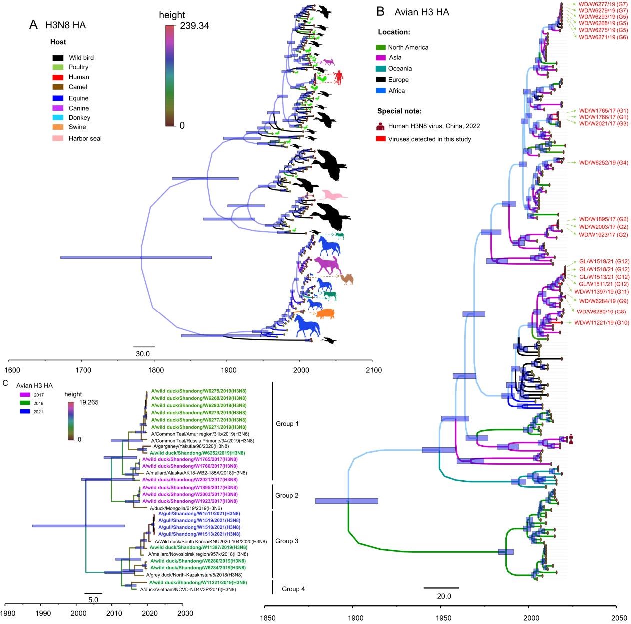 该研究获得了国家重点研发计划项目、山东省自然科学基金项目、兽医生物技术国家重点实验室开放课题重点项目的支持。本研究不仅为我国野鸟-家禽界面的H3N8亚型禽流感病毒监测提供了理论依据,也为我国人感染H3N8亚型禽流感病毒的溯源提供了重要的科学佐证。
