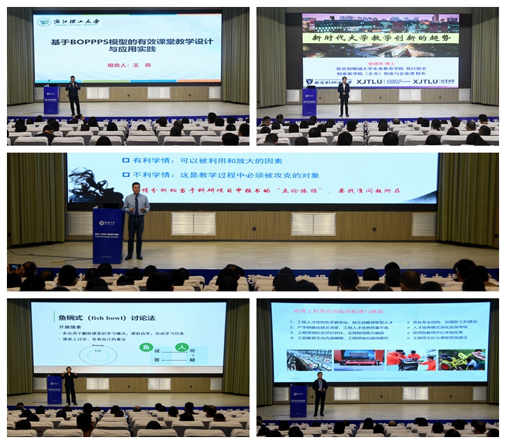 在专家报告和交流环节,周屈兰以《基于学生中心的教学设计与课堂示范》为题,介绍了进行学情分析、教学设计、教学评价以及教学创新的策略方法,并以他获得首届全国高校教师教学创新大赛一等奖作品为例,展示了基于学生中心的教学设计。王森以《基于BOPPPS模型的有效课堂教学设计与应用实践》为题,介绍了BOPPPS教学模型及其六大步骤,展现了“教中做,做中学,思想有启迪,实操有路径”的参与式教学理念。张晓军以《新时代大学教学创新的趋势:以研究导向型教学为例》为题,以研究导向型教学为例,阐释了新时代为什么要做教学创新,什么是好的教学创新以及如何做出有价值的教学创新。陈彦和赵岭分别以《基于合作学习,推进课堂教学改革》《认证引领,学生中心:谈工科专业基础课的教学效果提升方法》为题,分享了各自在教学理念、教学模式、教学方法等方面改革创新的经验与思考。