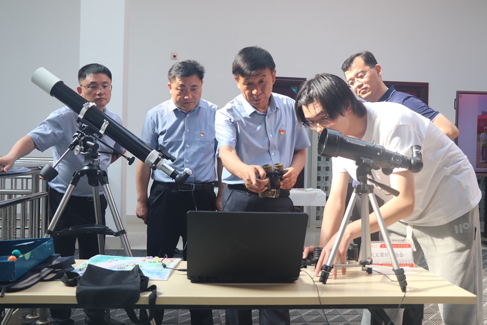 赵明吉一行参观了学生社团文化节成果展示,包含聊城大学“土木建筑协会”的天安门模型建筑、“天文爱好者协会”的天文望远镜以及“民间艺术协会”的民间艺术品木葫芦、剪纸等一系列精美作品,生动展现我校社团规范化管理、繁荣发展的丰富成果。赵明吉与各学生社团代表热情交流,对社团活动所取得的成果给予充分肯定。