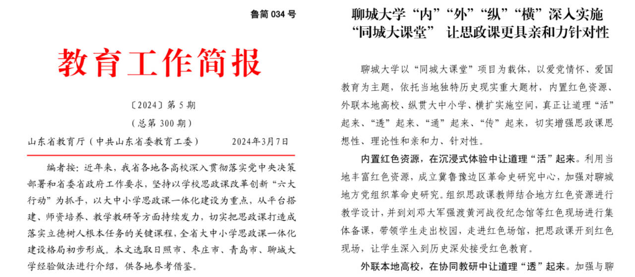 【编者按】3月7日,山东省教育厅(中共山东省委教育工委) 发布2024年第5期《教育工作简报》,以《聊城大学“内”“外”“纵”“横”深入实施'同城大课堂” 让思政课更具亲和力针对性》为题,介绍了聊城大学以“同城大课堂”项目为载体,以爱党情怀、爱国教育为主题,依托当地独特历史现实重大题材,内置红色资源 、外联本地高校、纵贯大中小学、横扩实施空间,切实增强思政课思想性、理论性和亲和力、针对性的先进做法。