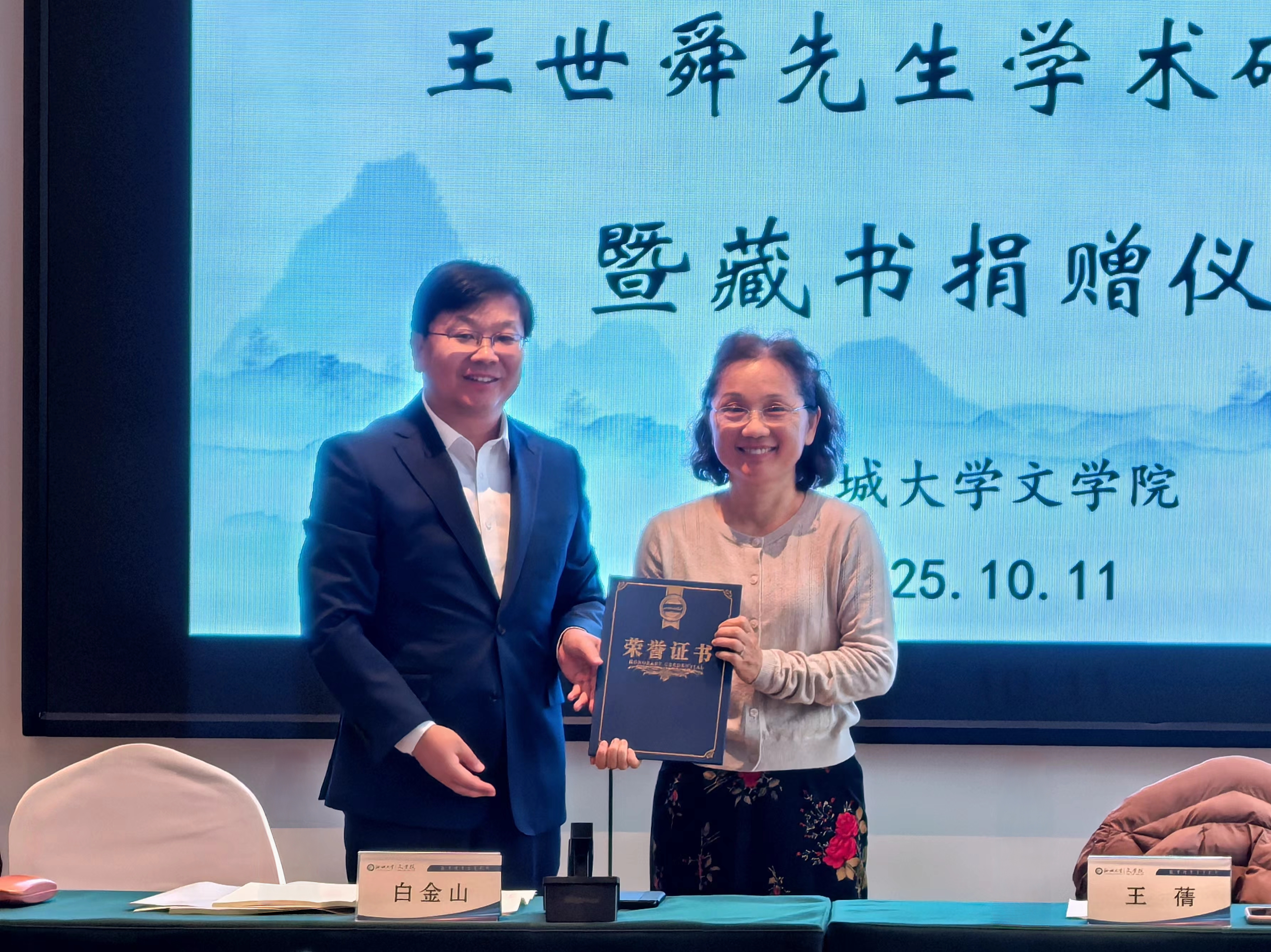 白金山向王蒨颁发藏书证书。2872册赠书将保存在聊城大学国学院。