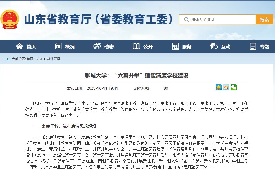 【编者按】10月14日,山东省教育厅网站战线联播栏目以《聊城大学:“六寓并举”赋能清廉学校建设》,报道了我校创新构建“寓廉于教、寓廉于文、寓廉于宣、寓廉于管、寓廉于制、寓廉于责”工作体系,为推动学校高质量发展注入“廉动力”的经验做法。