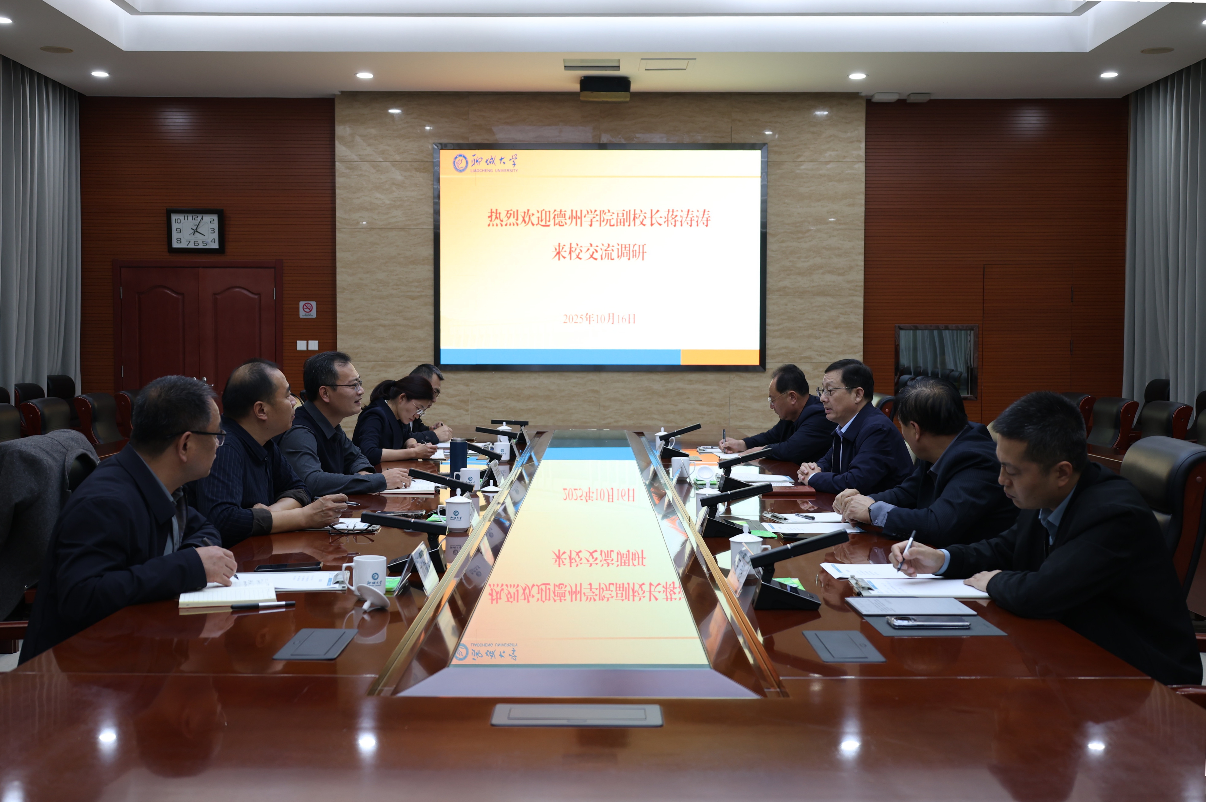 10月16日下午,德州学院党委委员、副校长蒋涛涛一行5人来我校交流访问。校党委副书记房增福出席座谈会并致辞,学生工作处(武装部)、安全保卫处、网络信息中心等单位负责人参加活动。