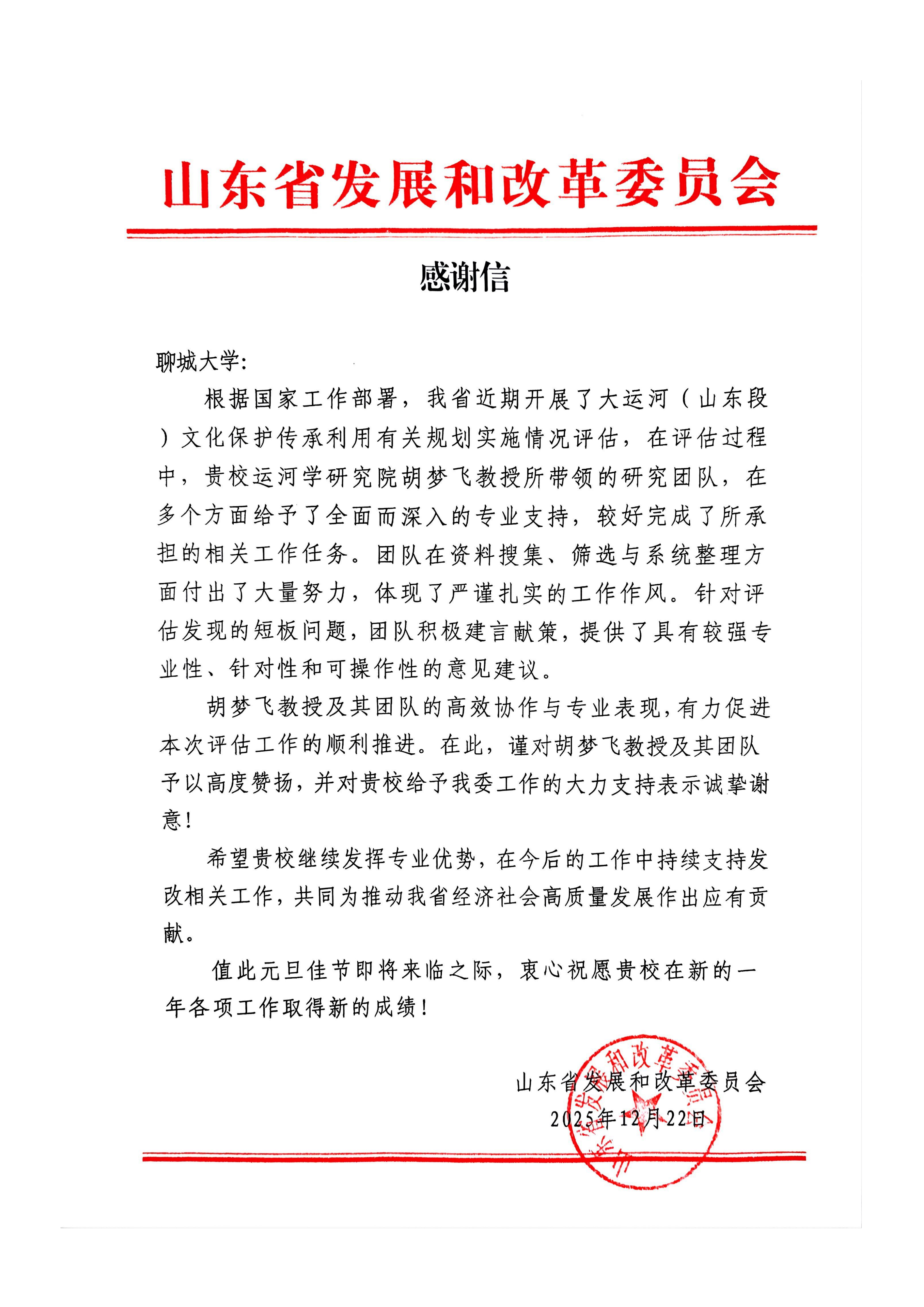 12月22日,我校收到山东省发展和改革委员会发来的感谢信,对我校运河学研究院胡梦飞教授在大运河(山东段)文化保护传承利用有关规划实施评估工作中所给予的大力支持表示感谢。