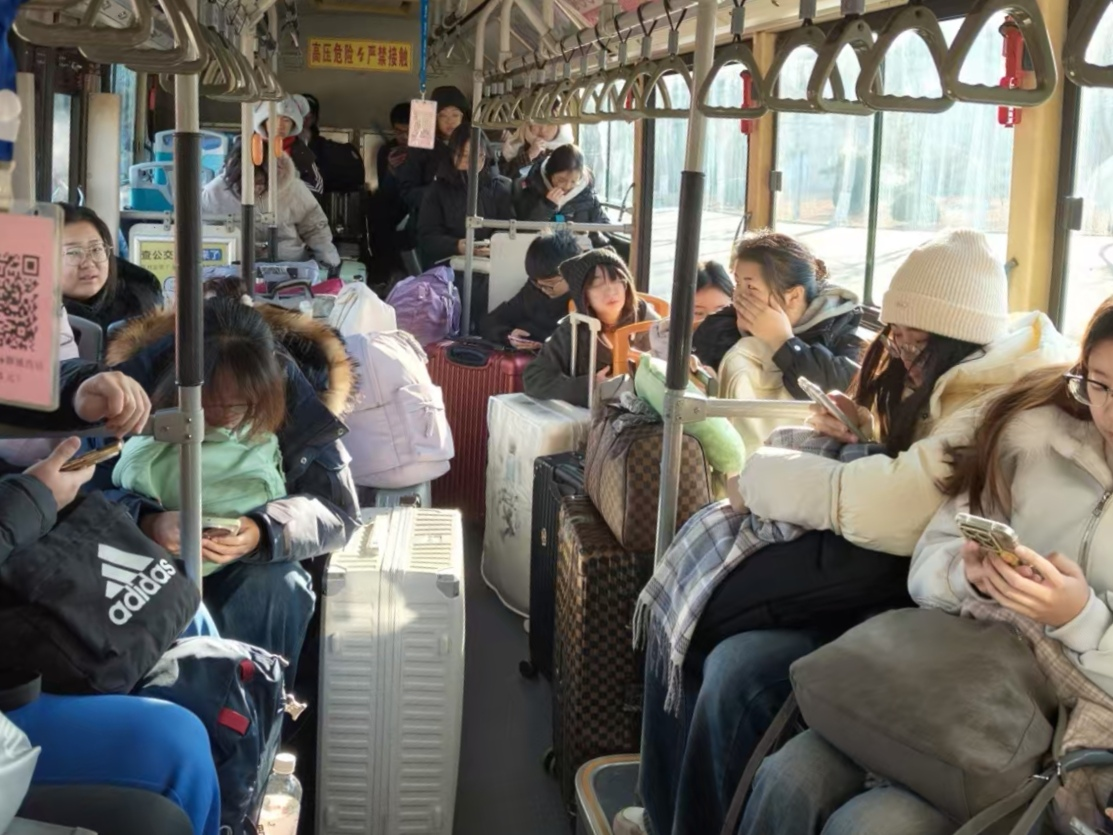 学校与聊城市公交集团建立全流程协同工作机制,将安全与关怀贯穿服务全过程。所有接驳车辆均经过多轮严格安全检测,配备经验丰富、熟悉路线的专业驾驶员,从源头筑牢出行安全防线;乘车点的工作人员及志愿者主动为学生搬运行李、耐心解答乘车疑问、细致核对车辆方向,全力避免错乘漏乘,用热情服务驱散冬日寒意。“本来还担心拖着行李箱挤公交麻烦,没想到学校直接把车开到校园里,还能直达车站落客平台,这份关怀太贴心、太实在了!” 刚顺利乘车的同学满脸笑意地说道。