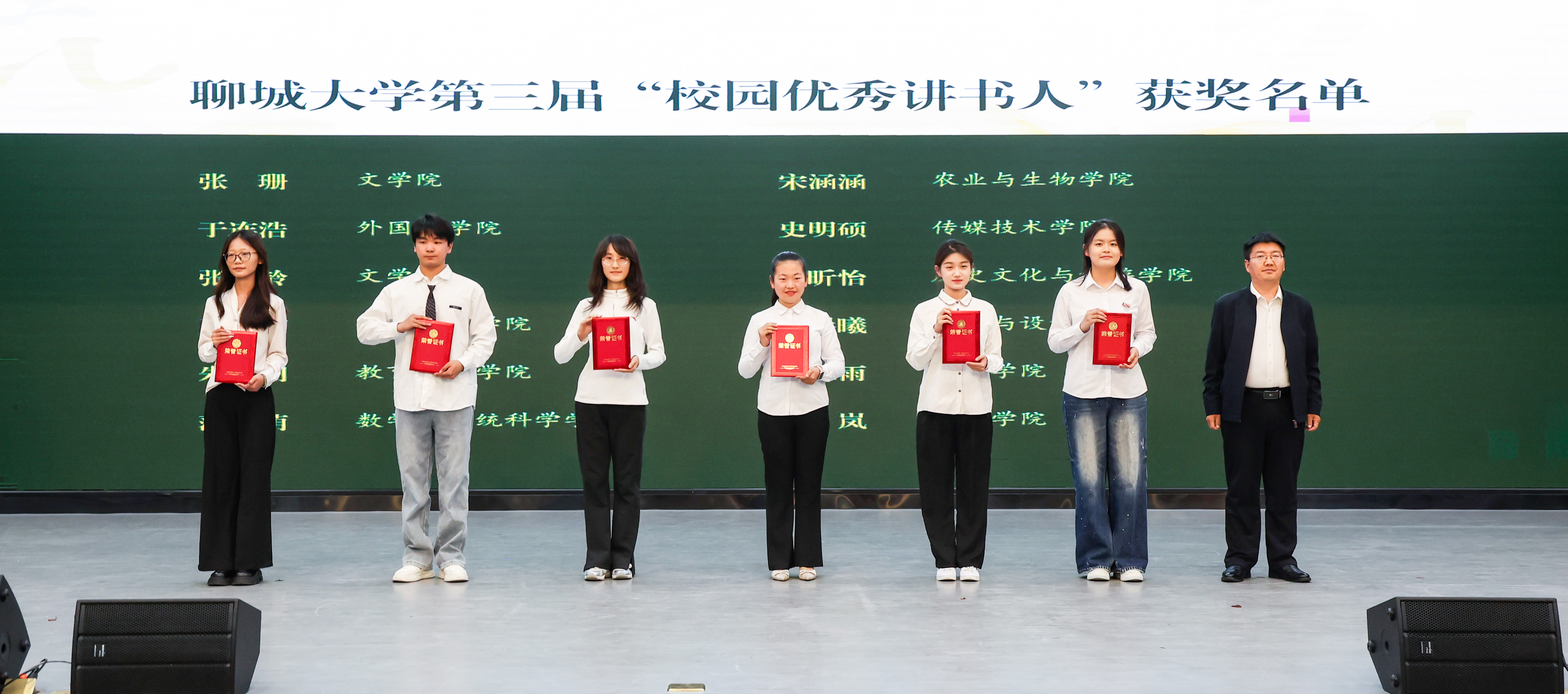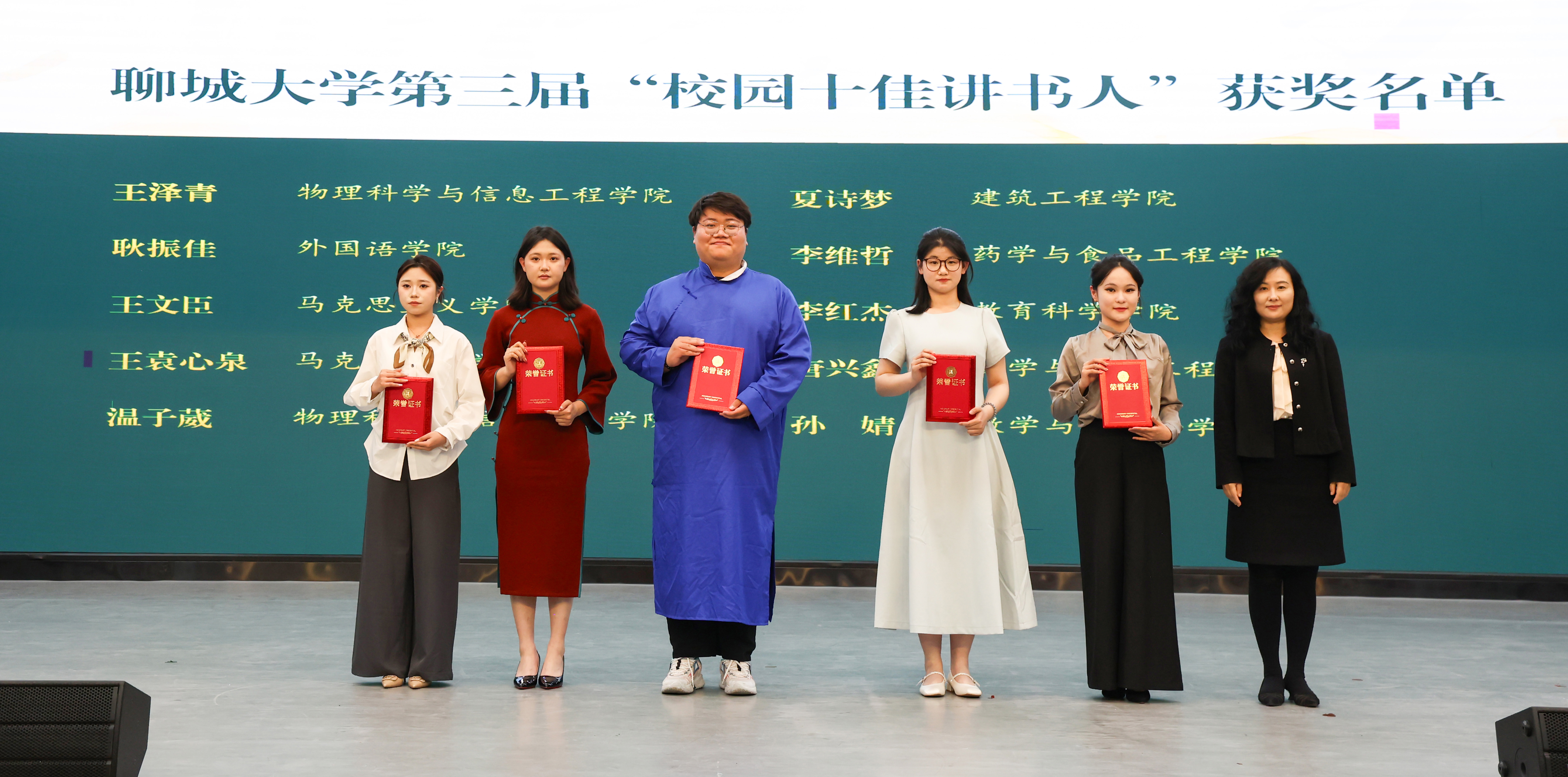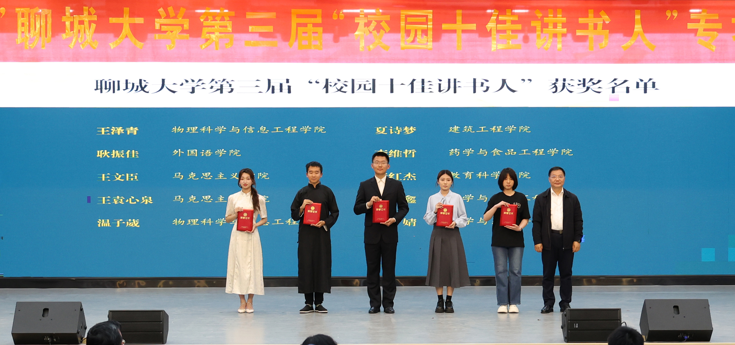 4月22日晚,在首个“全民阅读活动周”与第31个“世界读书日”来临之际,“青衿述典·声耀聊大”聊城大学第三届“校园十佳讲书人”专场展演暨颁奖典礼于辰晖楼青年之家隆重举行。校党委常委、副校长苏明海,副校长桑红燕,校党委常委、党委宣传部部长齐如林,出席活动并为获奖学子颁奖。校团委等相关职能部门负责人与三百余名师生代表齐聚一堂,共同聆听经典的青春脉动。
