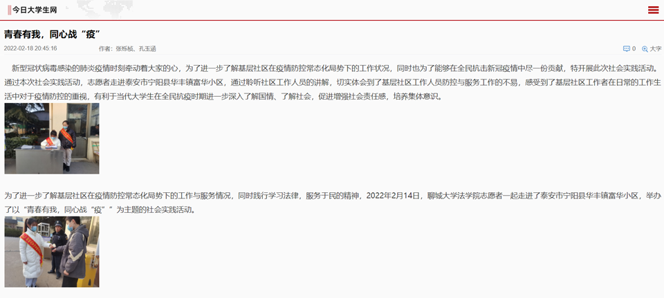 新型冠状病毒感染的肺炎疫情时刻牵动着大家的心,为了进一步了解基层社区在疫情防控常态化局势下的工作状况,同时也为了能够在全民抗击新冠疫情中尽一份贡献,特开展此次社会实践活动。通过本次社会实践活动,志愿者走进泰安市宁阳县华丰镇富华小区,通过聆听社区工作人员的讲解,切实体会到了基层社区工作人员防控与服务工作的不易,感受到了基层社区工作者在日常的工作生活中对于疫情防控的重视,有利于当代大学生在全民抗疫时期进一步深入了解国情、了解社会,促进增强社会责任感,培养集体意识。