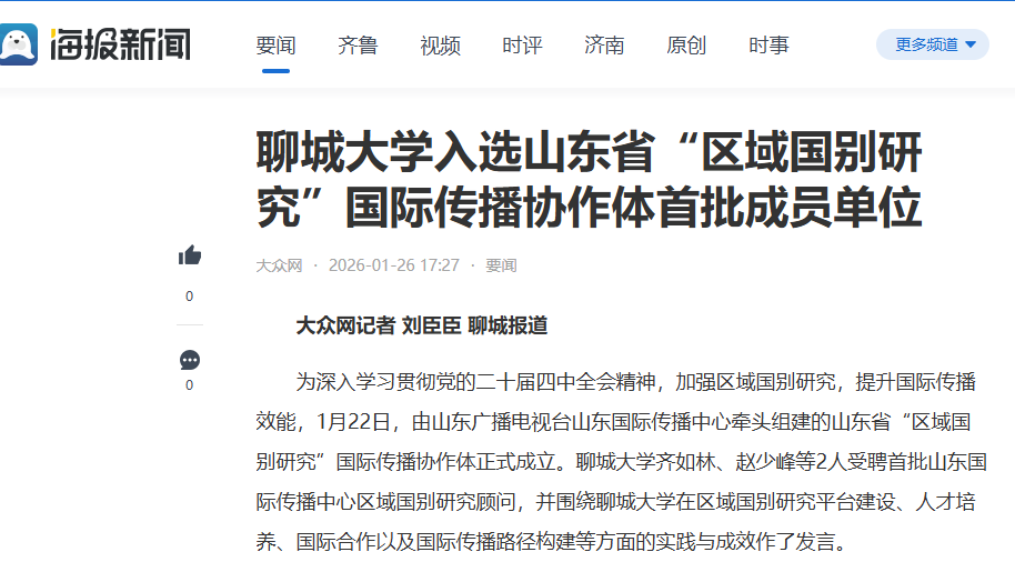 为深入学习贯彻党的二十届四中全会精神,加强区域国别研究,提升国际传播效能,1月22日,由山东广播电视台山东国际传播中心牵头组建的山东省“区域国别研究”国际传播协作体正式成立。聊城大学齐如林、赵少峰等2人受聘首批山东国际传播中心区域国别研究顾问,并围绕聊城大学在区域国别研究平台建设、人才培养、国际合作以及国际传播路径构建等方面的实践与成效作了发言。