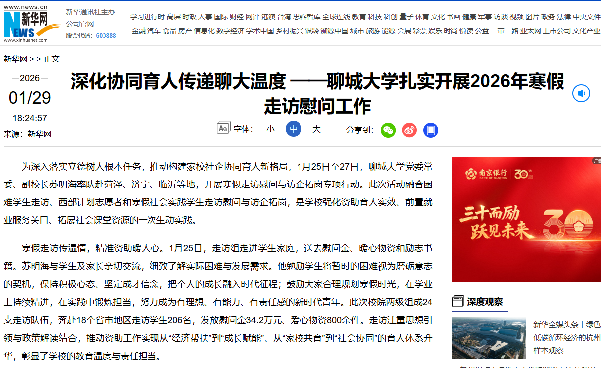为深入落实立德树人根本任务,推动构建家校社企协同育人新格局,1月25日至27日,聊城大学党委常委、副校长苏明海率队赴菏泽、济宁、临沂等地,开展寒假走访慰问与访企拓岗专项行动。此次活动融合困难学生走访、西部计划志愿者和寒假社会实践学生走访慰问与访企拓岗,是学校强化资助育人实效、前置就业服务关口、拓展社会课堂资源的一次生动实践。