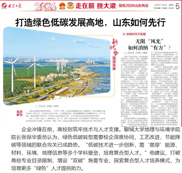企业冲锋在前,高校则筑牢技术与人才支撑。聊城大学地理与环境学院院长张保华委员认为,绿色低碳转型需要校企深度协同,工艺改进、节能降碳等领域的联合攻关已成趋势。“低碳技术进一步创新,需‘凿穿’能源、材料、环境、地理信息等多个学科壁垒,培育复合型人才。”他建议,打破高校专业目录限制、增设“双碳”急需专业,探索复合型人才培养模式,为培育更多“绿色”人才提供助力。