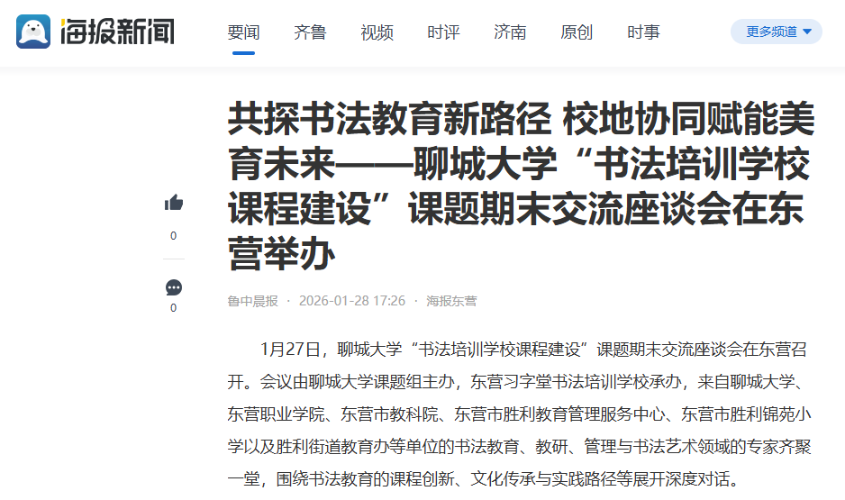 此次座谈会既是对课题阶段成果的一次检验,更凝聚了高校、政府、学校与社会机构的共同智慧。与会各方一致认为,书法教育应坚持“实践导向、文化为魂、协同共育”。会议为课题后续深化指明了方向,也为书法教育与地域文化、社区生活、学校课程的深度融合提供了可践行的“东营经验”,对推动中华优秀传统文化的创造性转化与创新性发展具有重要意义。(来源:鲁中晨报)